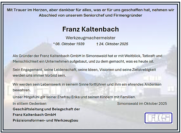 Wir sind ein mittelständisches Familienunternehmen mit Sitz in Simonswald im mittleren Schwarzwald, das 1979 von Franz Kaltenbach gegründet wurde.